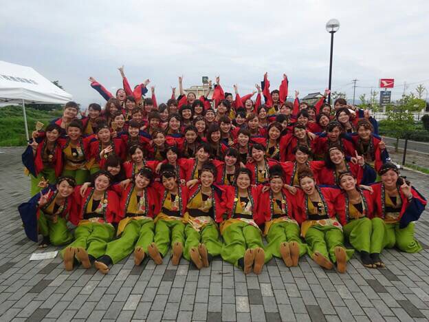 駅前通り第二会場でお客さんをすぐ目の前に演舞させていただきました♪私達が登場してすぐに「ぽっそーー!」と声を掛けてくださる方や演舞を見て楽しそうに乗ってくださる方がたくさんいて、お客さんと一体になって踊ることが出来ました!